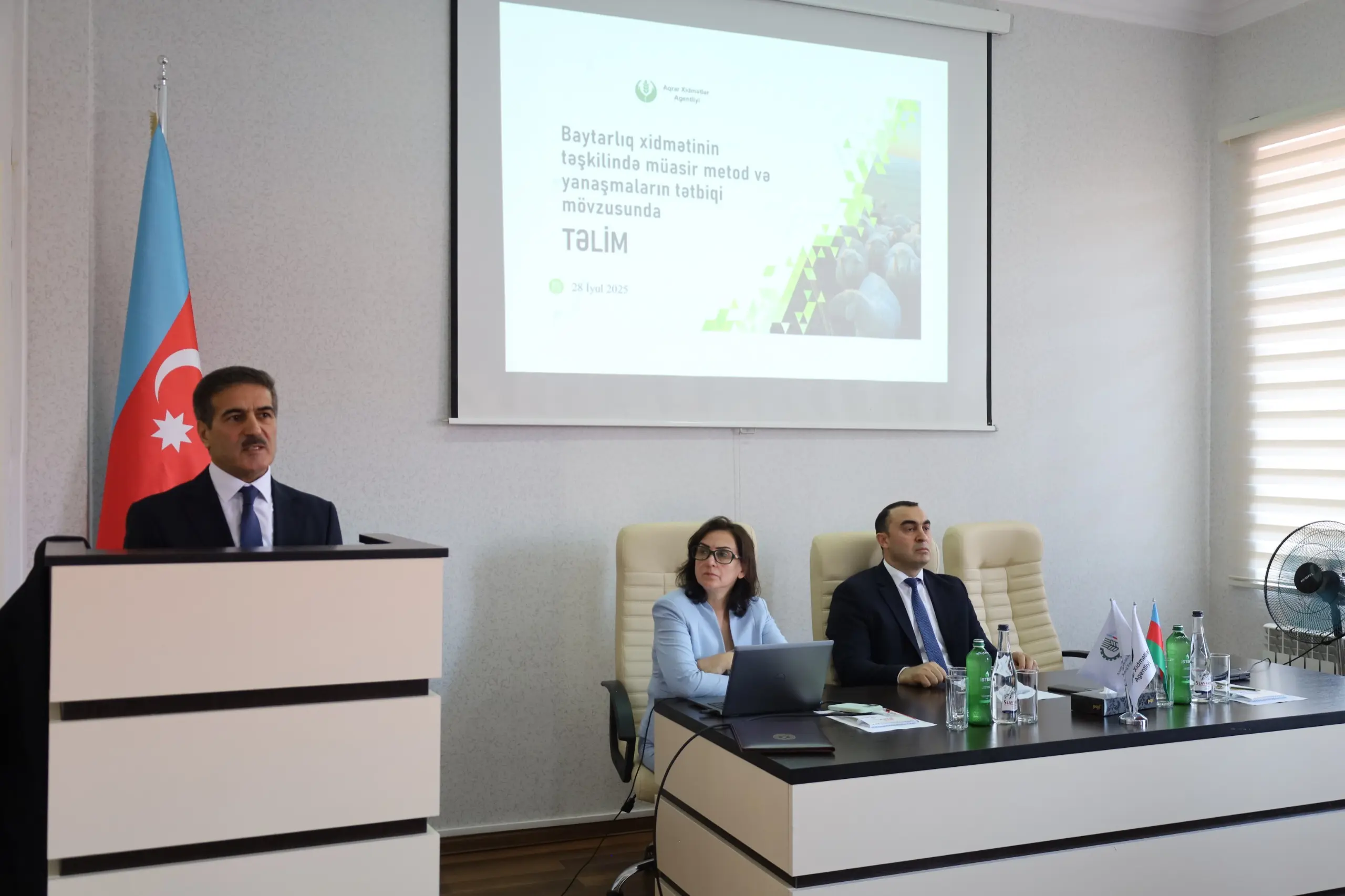 Aqrar Xidmətlər Agentliyinin və Almaniyanın qabaqcıl İDEXX şirkətinin distribyutoru olan “VET DIAQNOSTIKA” MMC təşkilatçılığı ilə “Baytarlıq xidmətinin təşkilində müasir metod və yanaşmaların tətbiqi” mövzusunda təlim keçirilib. Təlimin əsas məqsədi heyvan sağlamlığı sahəsində xidmətlərin təkmilləşdirilməsi və baytarlıq sahəsində qabaqcıl yanaşmaların tətbiqinə dair bilik və bacarıqların artırılmasıdır.