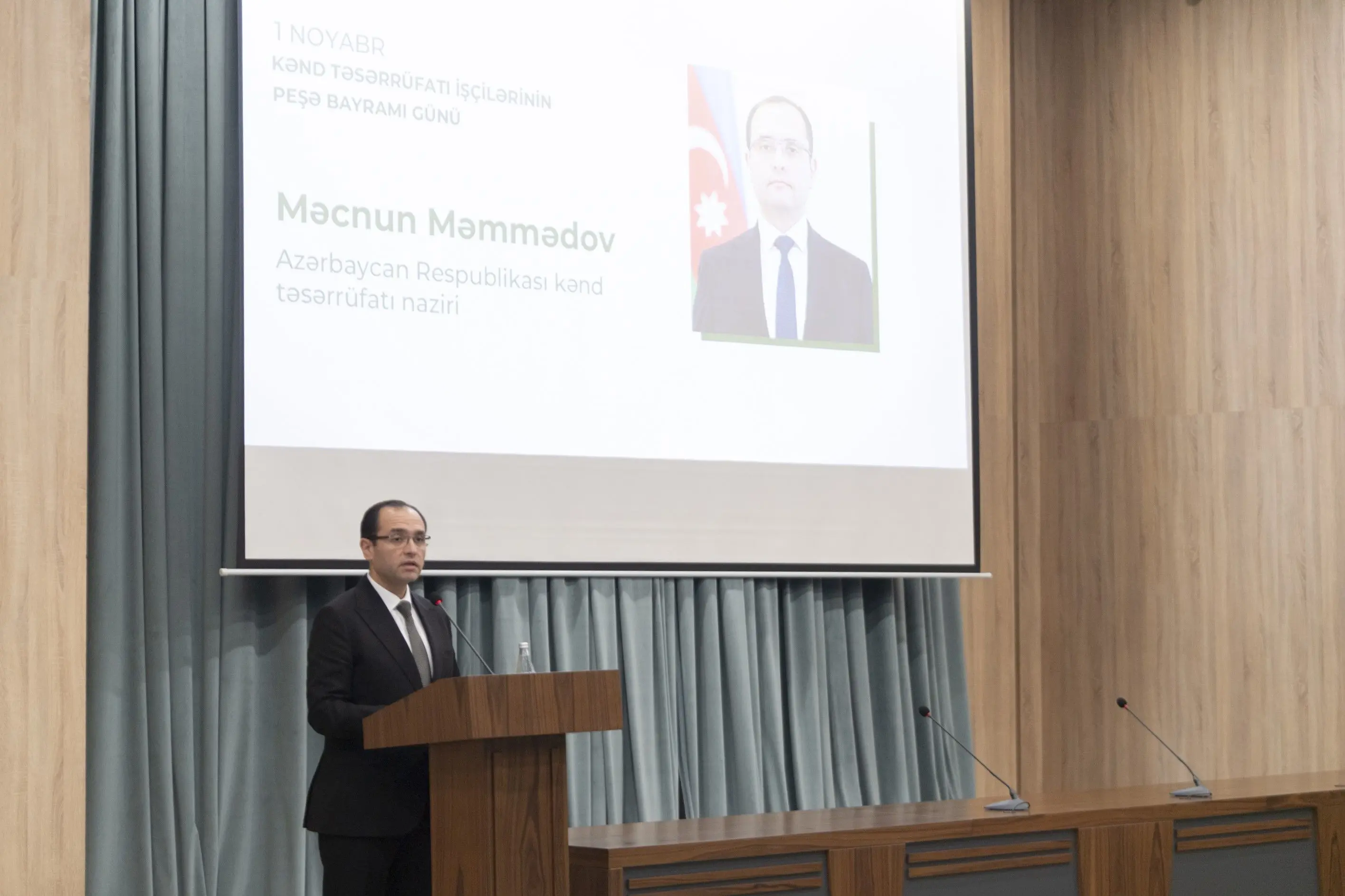 Tədbiri giriş sözü ilə açan kənd təsərrüfatı naziri Məcnun Məmmədov peşə bayramı münasibətilə fermerləri təbrik edib. Nazir bildirib ki, Azərbaycan Respublikasında aqrar siyasətin formalaşması və müasir inkişaf mərhələsinə keçidin əsası Ulu öndər Heydər Əliyev tərəfindən qoyulub. Ümummilli liderin rəhbərliyi ilə kənd təsərrüfatının iqtisadiyyatda strateji əhəmiyyəti müəyyən edilib, torpaq islahatları həyata keçirilib, mülkiyyət münasibətləri formalaşdırılıb, kənd əhalisinin sosial rifahının yüksəldilməsi istiqamətində fundamental addımlar atılıb. Ulu öndər Heydər Əliyevin təşəbbüsü ilə qəbul olunan mühüm qərarlar nəticəsində aqrar sahədə dövlət idarəçiliyi sistemi təkmilləşdirilib, ərzaq təminatında daxili istehsalın payı əhəmiyyətli dərəcədə artıb.